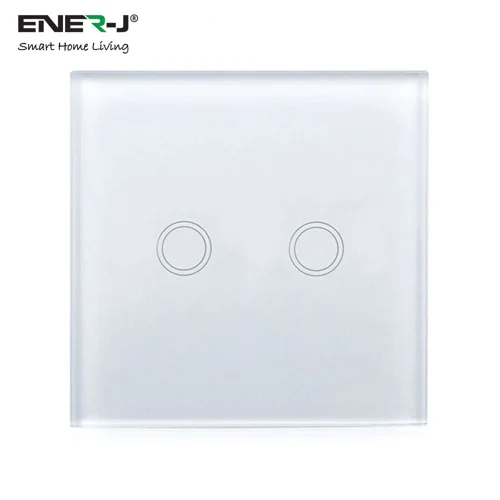 A smart 2 gang touch switch finished in a stylish white glass that will glow blue. This smart wifi switch from Ener-J will seamlessly replace an old wall light switch. The switch is easily installable and economical. The switch will need a neutral wire and a 33mm back box will be required. The smart enabled 2 gang switch is compatible for use with google home and amazon alexa smart hubs thanks to built in technology and can also be controlled via your smart phone/tablet with the downloading of Ener-Js application. Supplied with a 2 year product warranty. Works on a 2.4G wifi frequency (Not compatible with 5G) See downloads for installation details + additional technical specifications. Product Dimensions: 86mm x 86mm.