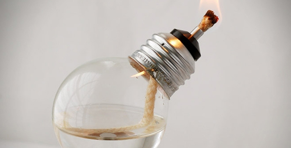 Fill an old incandescent bulb with oil, secure a wick and light a match for a beautiful take on a classic oil lamp.