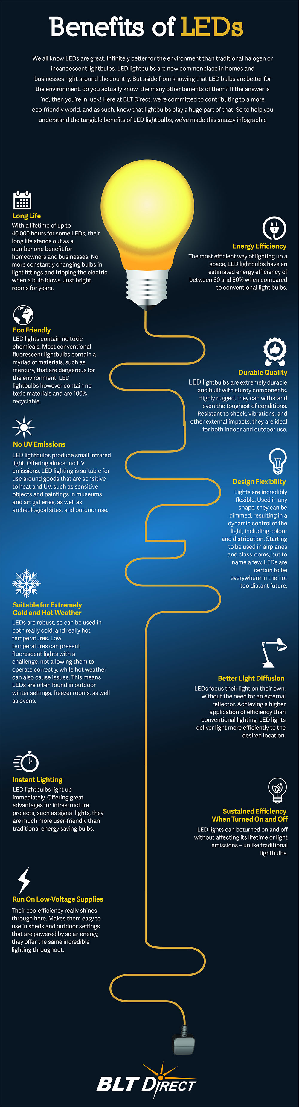 But aside from knowing that LED bulbs are better for the environment, do you actually know the benefits of them? If the answer is ‘no’, then you’re in luck! Here at BLT Direct, we’re committed to contributing to a more eco-friendly world, and as such, know that lightbulbs play a huge part of that. So to help you understand the tangible benefits of LED lightbulbs, we’ve made this snazzy infographic!