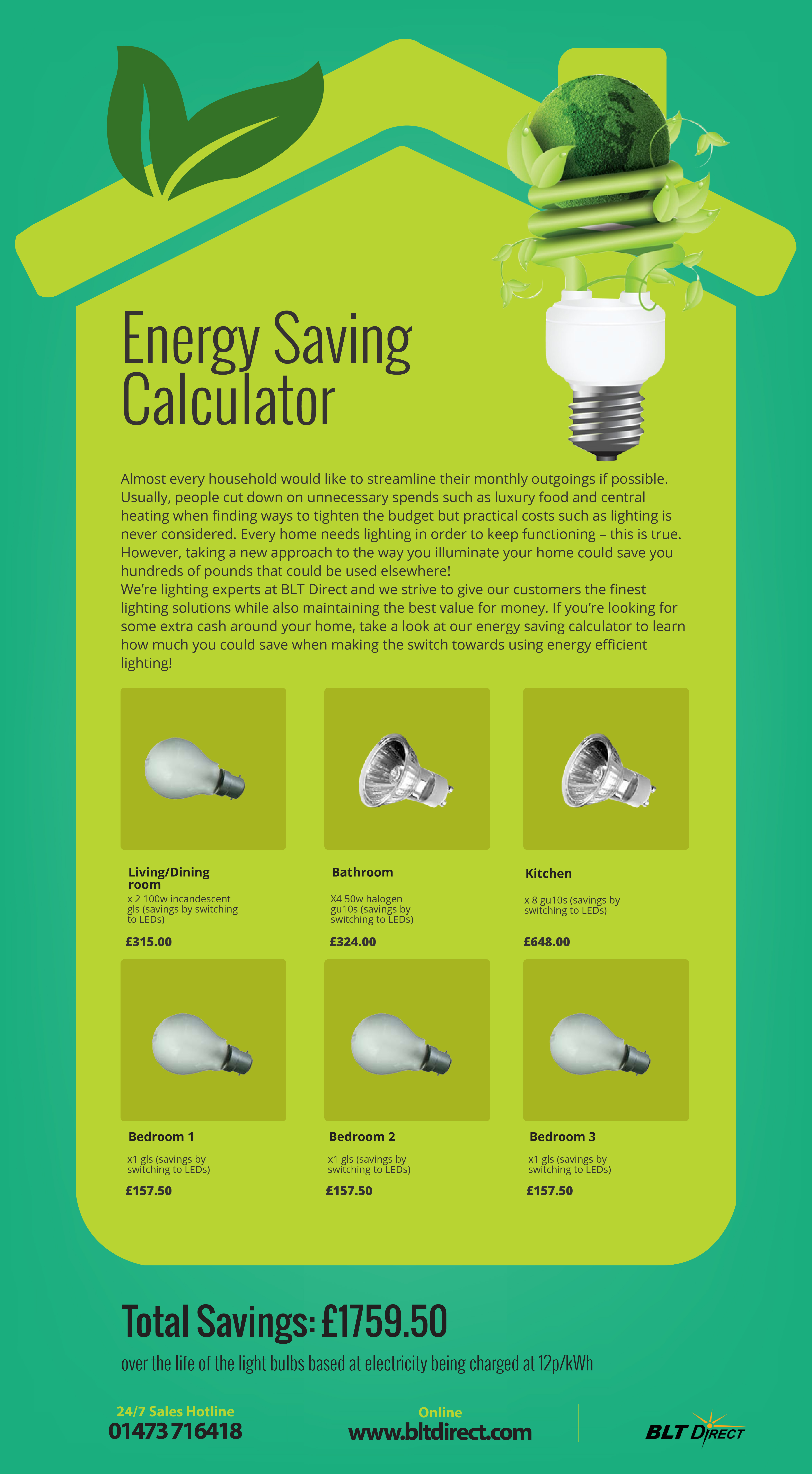 We’re lighting experts at BLT Direct and we strive to give our customers the finest lighting solutions while also maintaining the best value for money. If you’re looking for some extra cash around your home, take a look at our energy saving calculator to learn how much you could save when making the switch towards using energy efficient lighting!