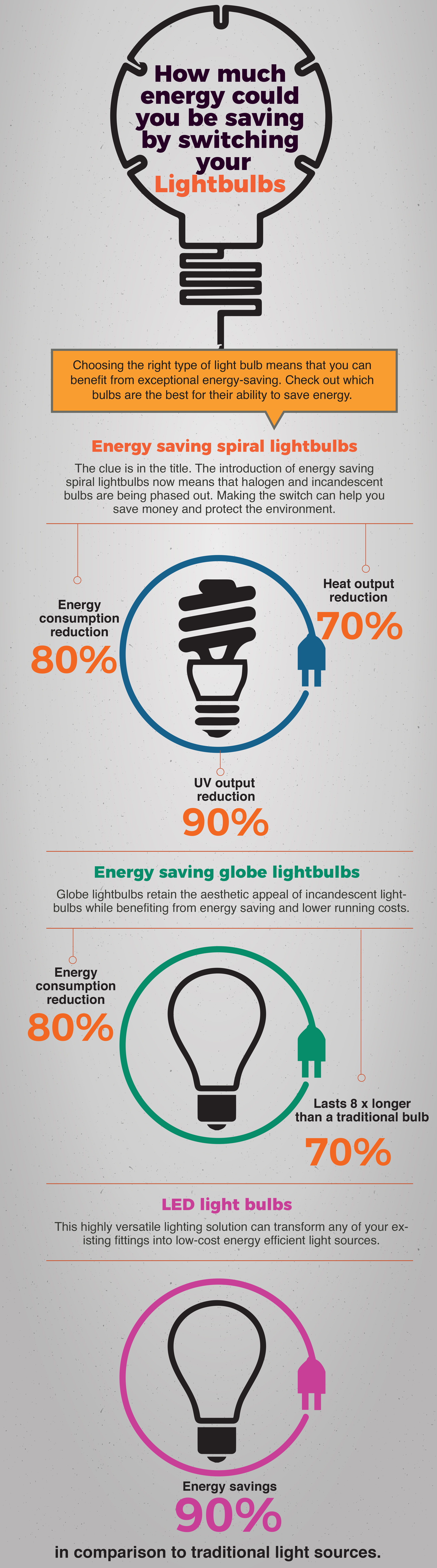 When it comes to energy saving, making the right choices with your lightbulbs is imperative. Whether you choose LED or energy saving options, it’s time to say goodbye to those outdated bulbs and push your lighting into the 21 st century. By referring to our handy infographic you’ll be able to see the massive saving and reductions in heat output and energy consumption that can be made and will also see how much longer different types of lightbulbs will last.