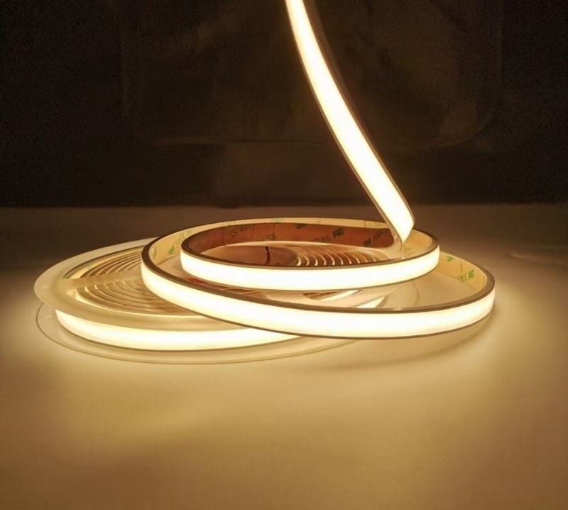 COB LED strip is a thin, flexible strip of light with Chip-on-Board technology, in which multiple small LED chips are mounted directly into the strip's surface, one after another. COB strips produce even, continuous, and smooth lighting throughout the length the strip, unlike the traditional LED strips that have distinctly separate patches of light. They are perfect for modern interiors, ambient lighting, and wherever you want even light without borders.
